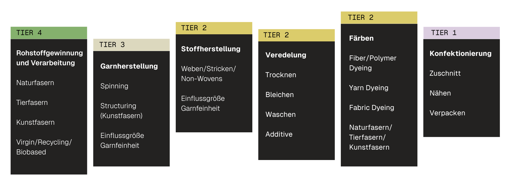 Die textile Wertschöpfungskette ist vielschichtig. Unternehmen haben in der Regel direkte Geschäftsbeziehungen zu ihren Zulieferern in der Konfektion (Tier 1). Der Blick auf vorgelagerte Stufen – von der Stoff- und Garnherstellung (Tier 2 und 3) bis zur Rohstoffgewinnung (Tier 4) – bleibt oft eingeschränkt.