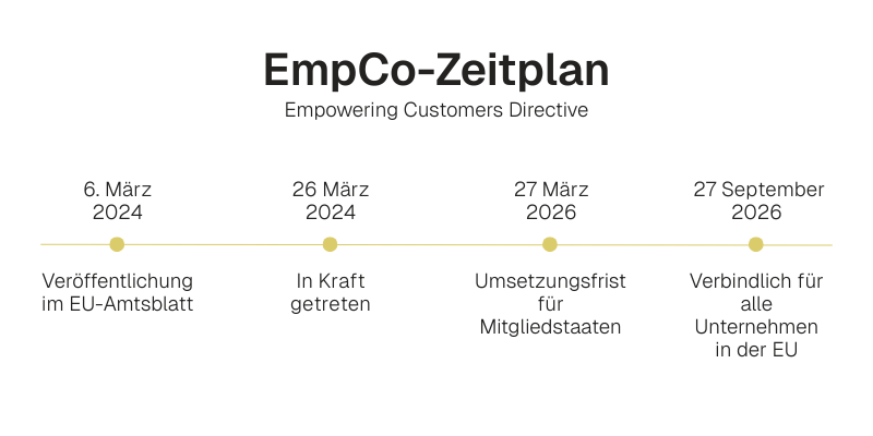 Die EU-Mitgliedstaaten müssen EmpCo bis 27. März 2026 umsetzen. Für Unternehmen gelten die neuen Vorschriften ab dem 27. September 2026 verbindlich.