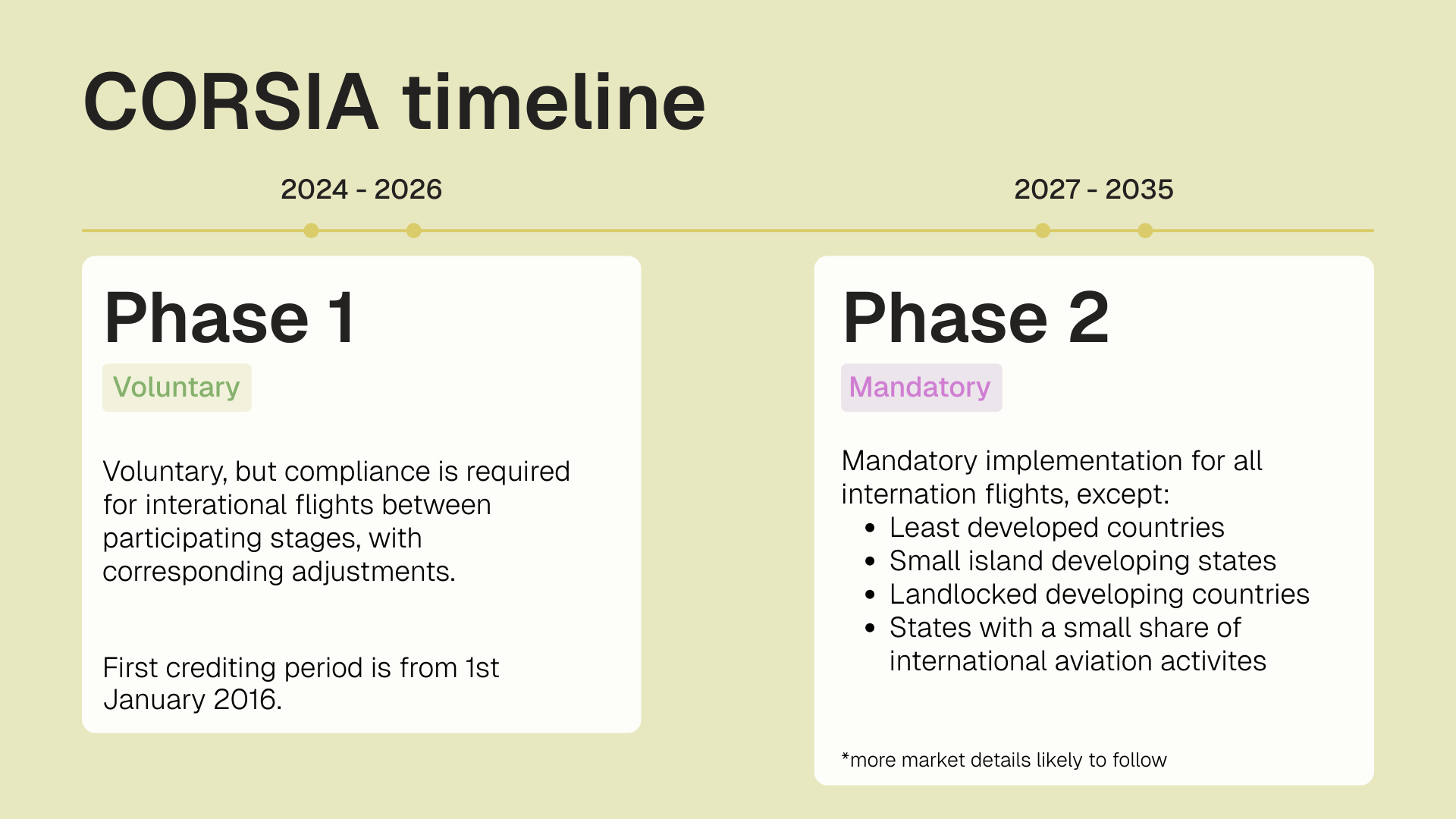 The baseline for CORSIA is set as the average carbon emissions from 2019 and 2020. However, due to the significant drop in air traffic caused by the COVID-19 pandemic, only 2019 emissions data was used during the Pilot Phase (2021–2023). The scheme then transitions into Phase I (2024–2026) and Phase II (2027–2035), with the shift from voluntary to mandatory participation beginning in Phase II.