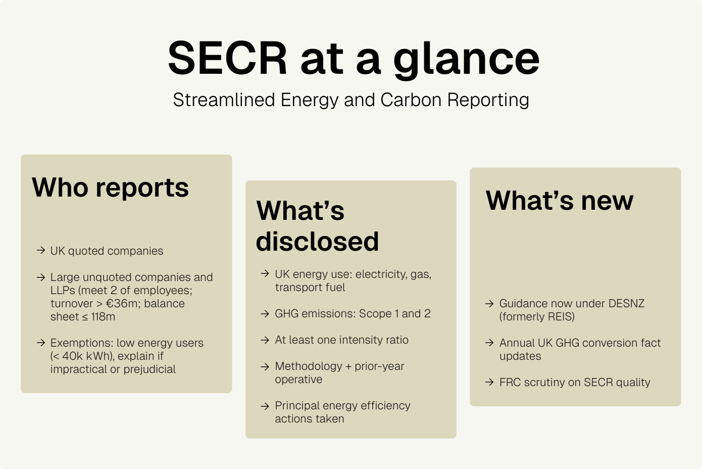- With ESOS (Energy Savings Opportunity Scheme) Phase 3 putting action plans front and centre, leading organisations are using SECR as the annual progress lens to track delivery, quantify savings, and show momentum.