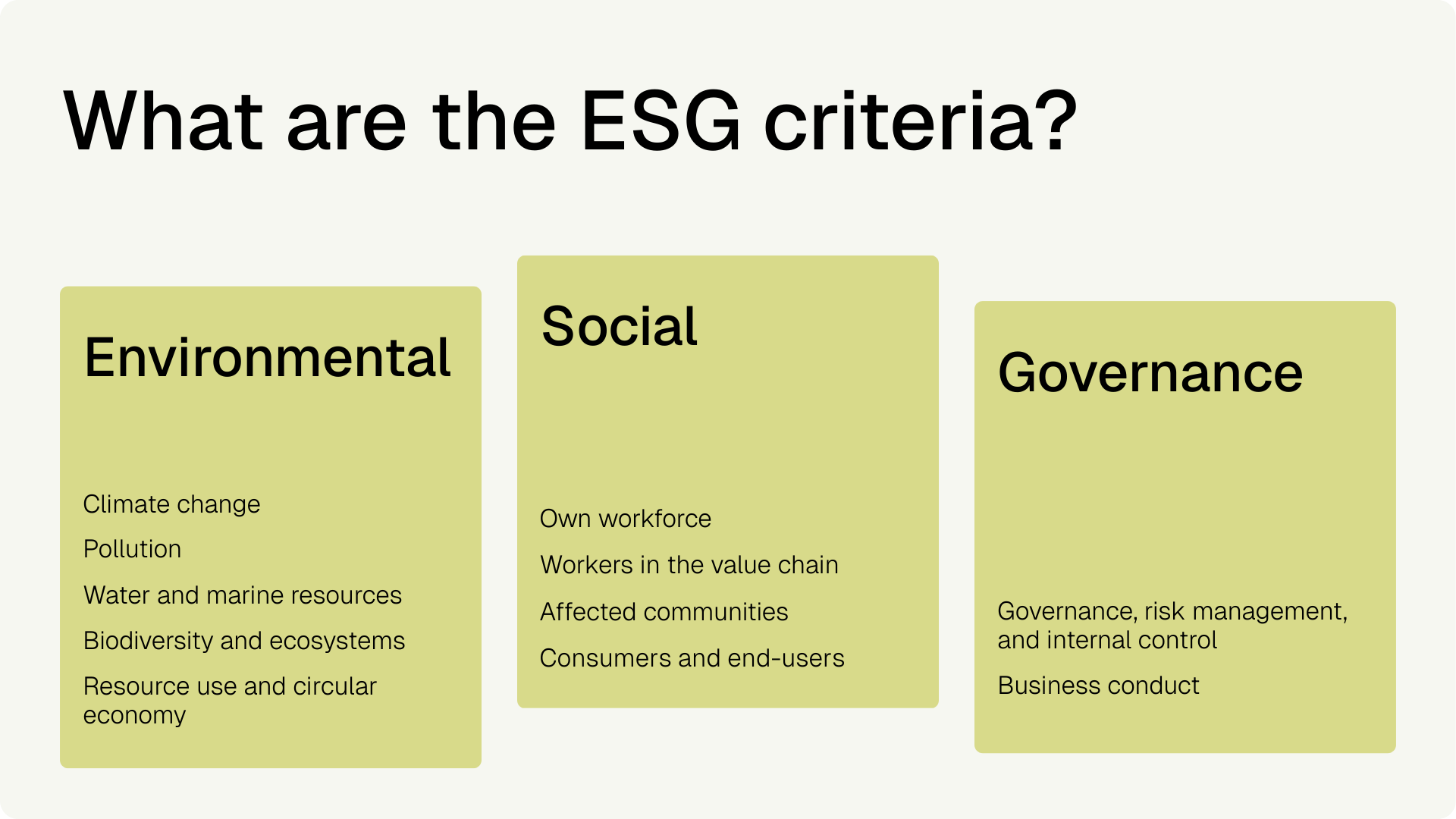 The Directive stipulates that the following environmental, social, and governance (ESG) aspects be considered when drawing up the reporting standards. They have each been compiled by EFRAG in the 12 reporting standards: