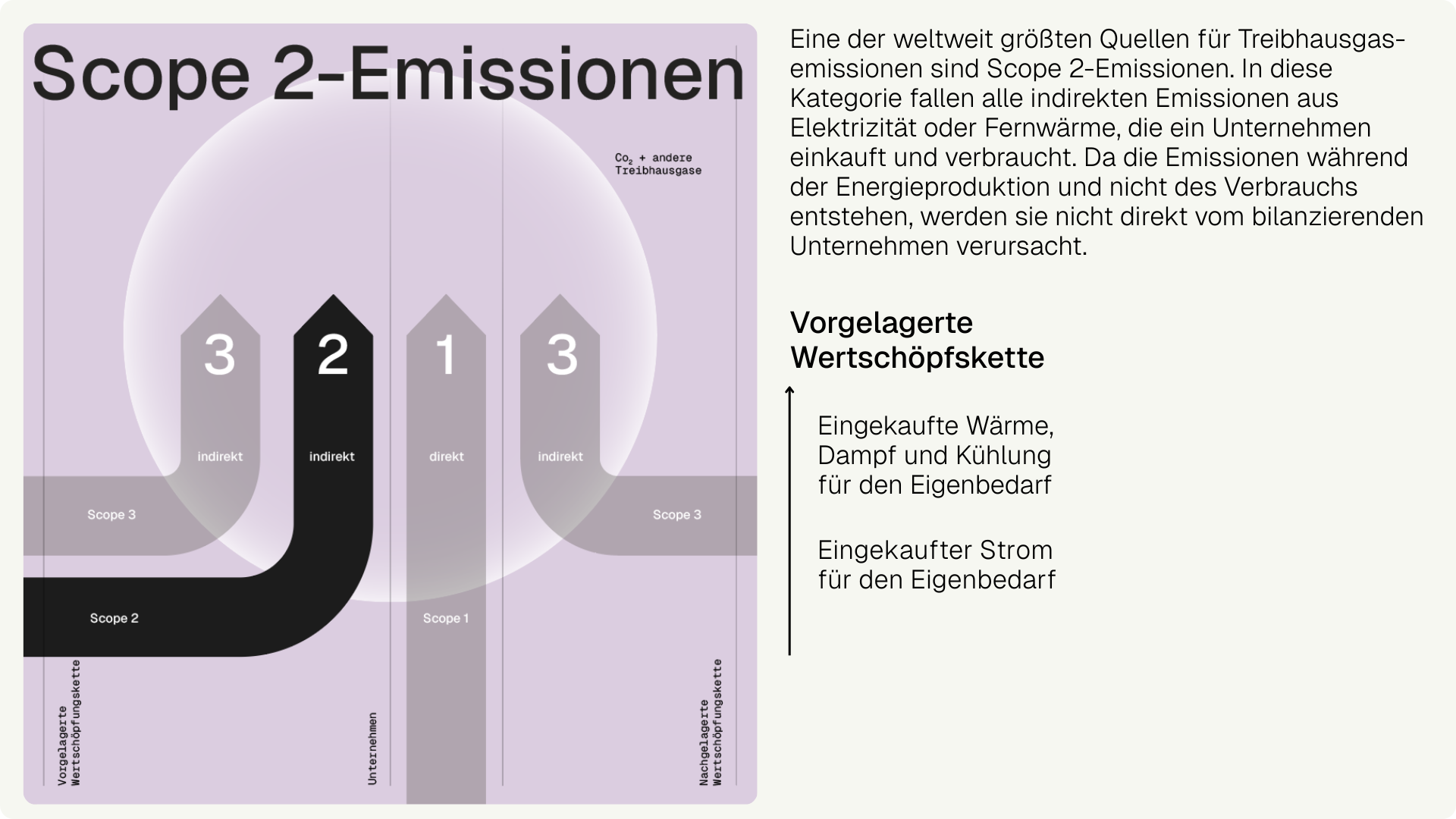 Scope 2 umfasst alle indirekten Emissionen, die durch die Erzeugung von eingekaufter Energie entstehen. Alle anderen Emissionen aus der Produktion und Verarbeitung von Brennstoffen und der Verteilung von Energie über ein Energienetz werden unter Scope 3 erfasst.