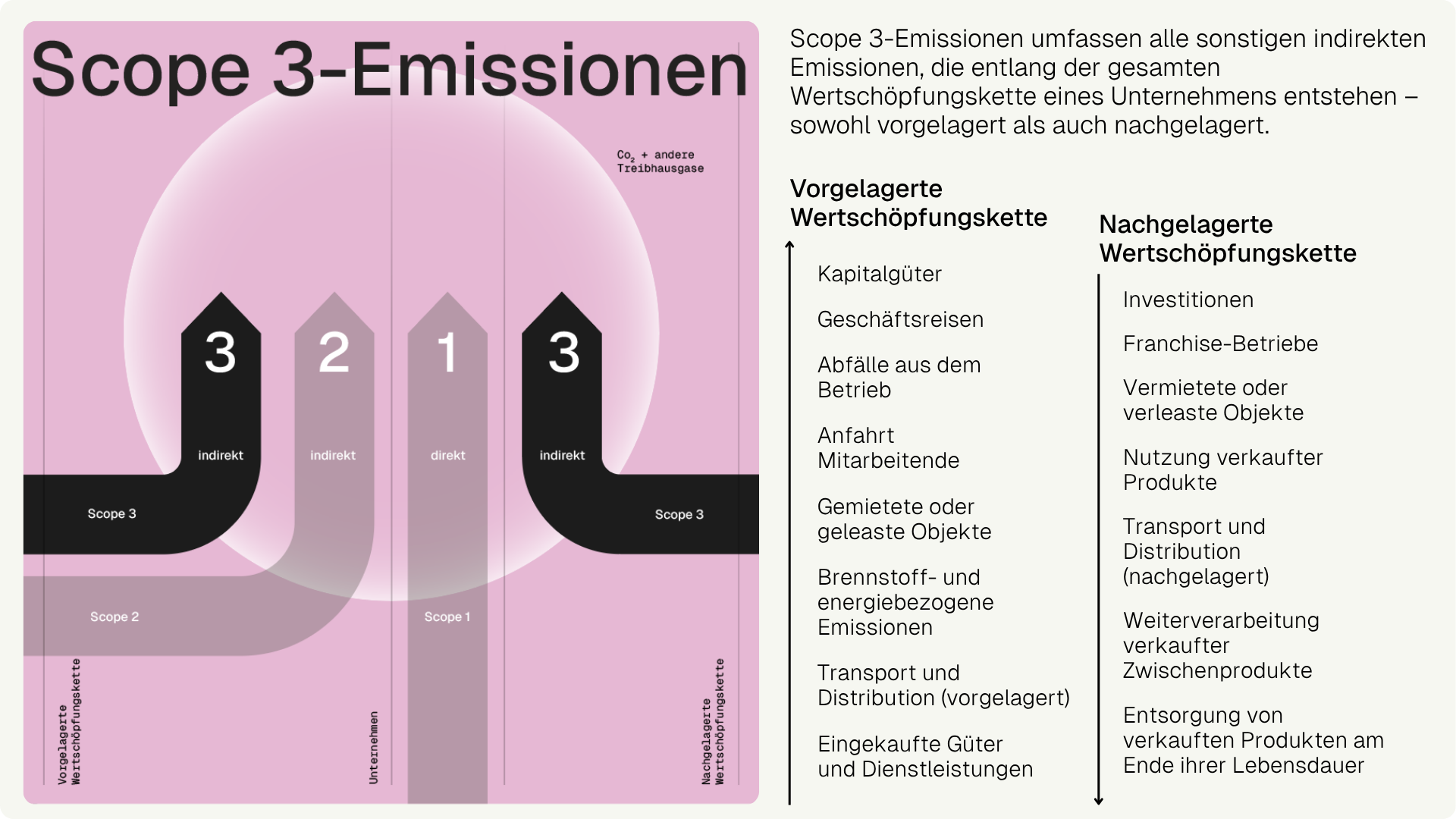 Die Scope 3-Emissionen machen in der Regel den größten Anteil am CO2-Fußabdruck eines Unternehmens, dem sogenannten Corporate Carbon Footprint, aus und entstehen durch vor- und nachgelagerte Aktivitäten entlang der Wertschöpfungskette, wie zum Beispiel den Transport und die Verteilung von Waren und Dienstleistungen oder die Entsorgung von Produkten durch den Endverbraucher. Weitere Quellen von Scope 3-Emissionen sind die Gewinnung und Produktion eingekaufter Rohstoffe und der Gebrauch verkaufter Produkte und Dienstleistungen.
