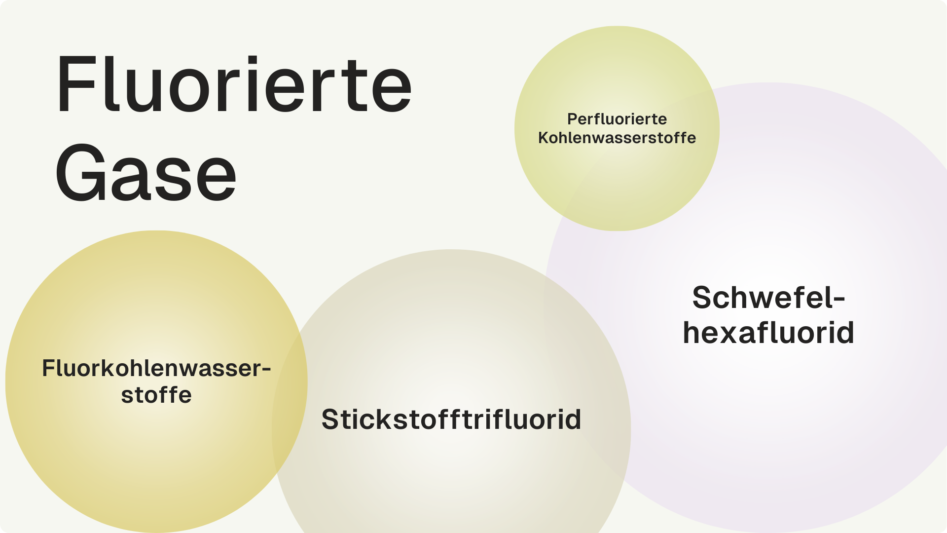 Fluorierte Gase haben ein bis zu 10.000-mal höheres GWP als CO₂ und machen 2,6 % der globalen Emissionen aus. Trotz ihres geringen Anteils verbleiben sie Hunderte bis Tausende Jahre in der Atmosphäre. Sie werden vor allem als Kühlmittel, Lösungsmittel und in der Produktion eingesetzt. Seit dem Montrealer Protokoll werden sie aufgrund ihres Beitrags zum Ozonabbau reguliert.