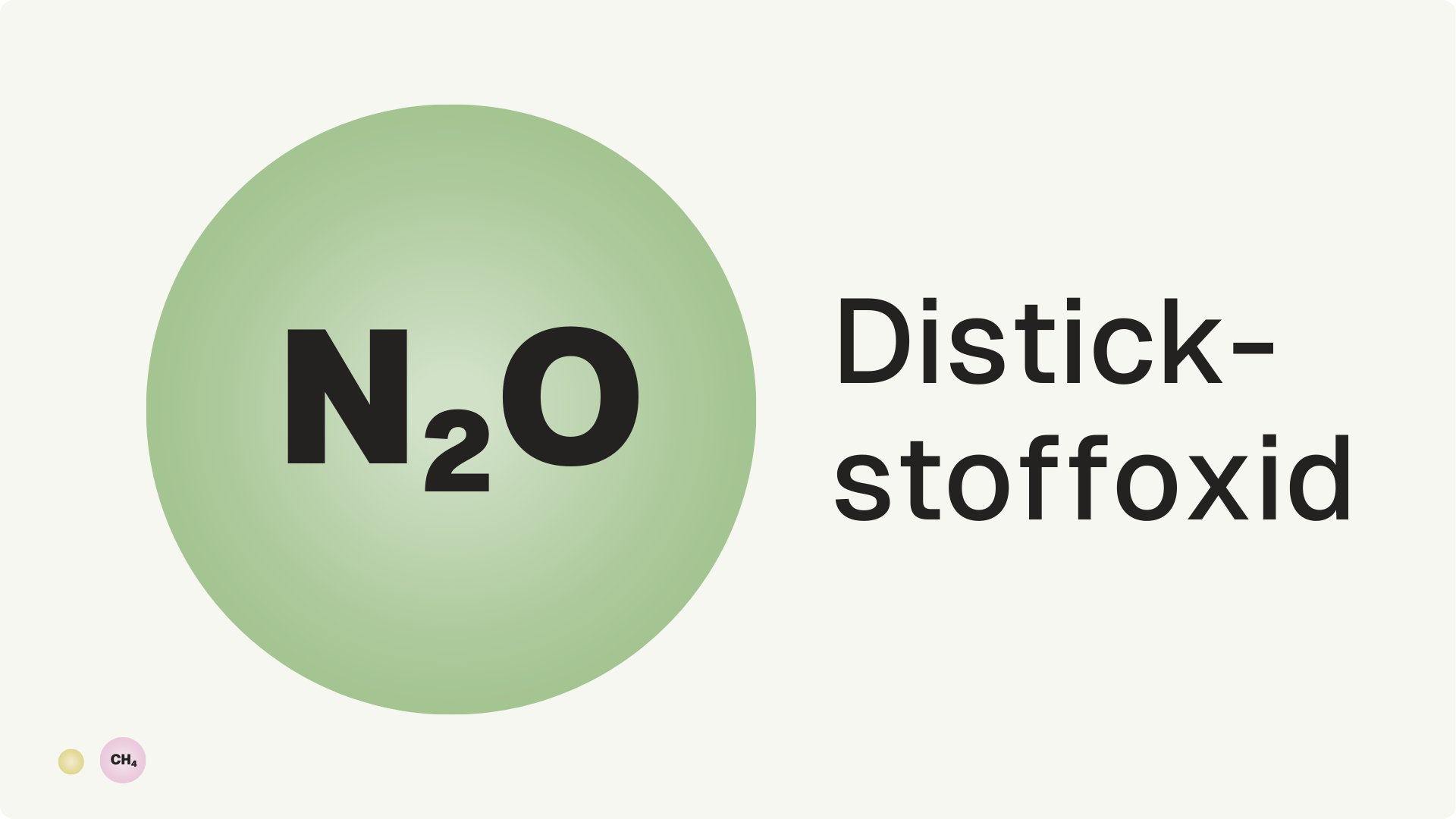 Distickstoffoxid trägt zu 4,8 % der Treibhausgasemissionen bei. Über einen Zeitraum von 100 Jahren ist es 264-mal stärker als CO2 und bleibt etwas mehr als ein Jahrhundert in der Atmosphäre. Hauptquellen sind Landwirtschaft, insbesondere Düngemittel, sowie Abfalldeponien. Wegen seiner betäubenden Wirkung wird es auch als Lachgas bezeichnet.