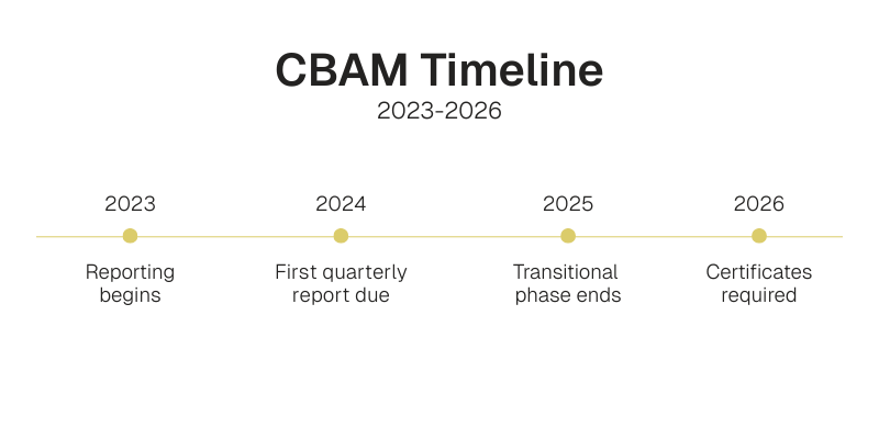 The Transitional Phase (2023-2025) allows importers to report carbon emissions without financial penalties, helping them adapt to CBAM regulations. Businesses must register with their National CBAM Competent Authority (NCA) and submit quarterly emissions reports, with the first due January 31, 2024.