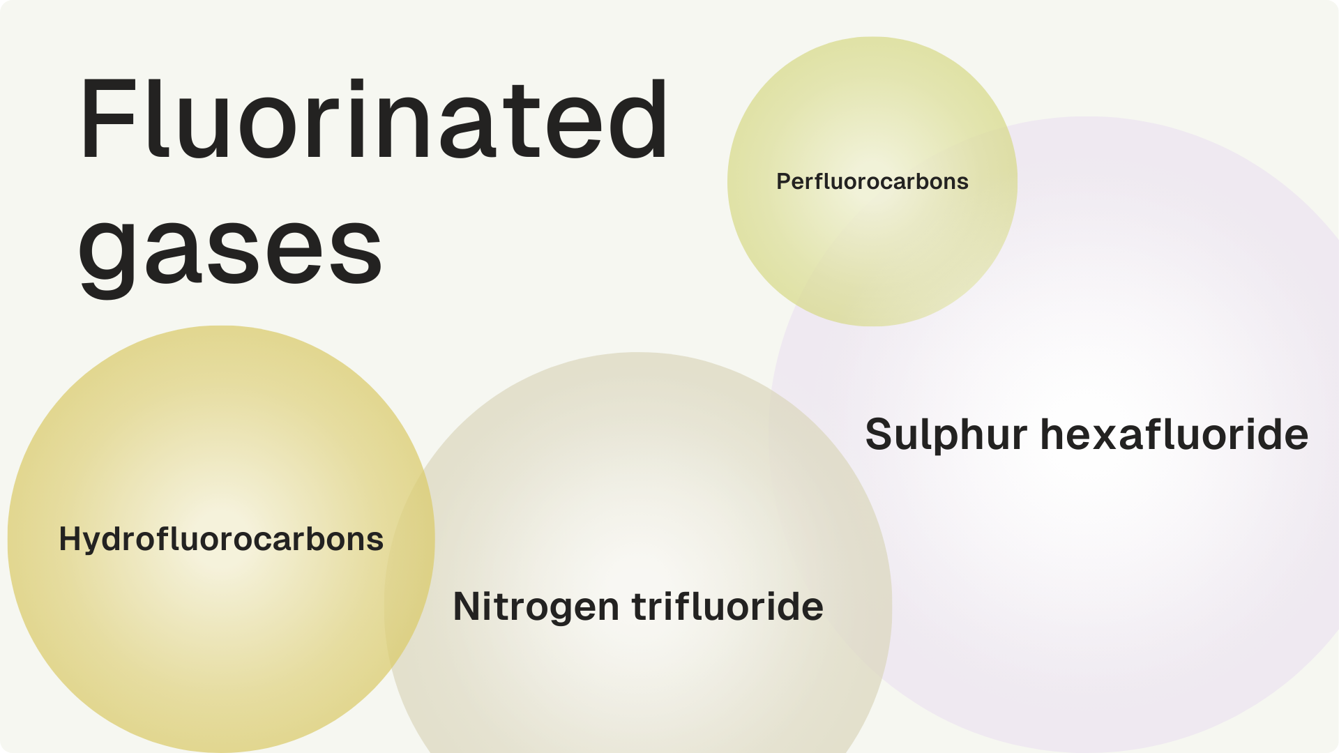 Fluorinated gases are a group of gases that contain fluorine. These compounds have a GWP of up to tens of thousands of times greater than CO2 and have been regulated since the Montreal Protocol because of their depletion of the ozone layer. Although they are only 2.6% of GHG emissions, F-gases reside in the atmosphere for hundreds to thousands of years. They are primarily used as refrigerants, solvents, and in manufacturing.